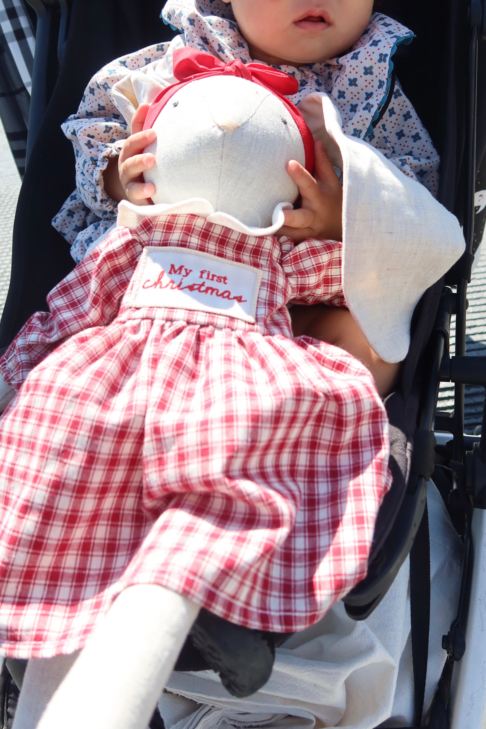 Hecha a mano con lino orgánico y detalles bordados, lleva un vestido a cuadros rojo con cuello blanco y un moño a juego.